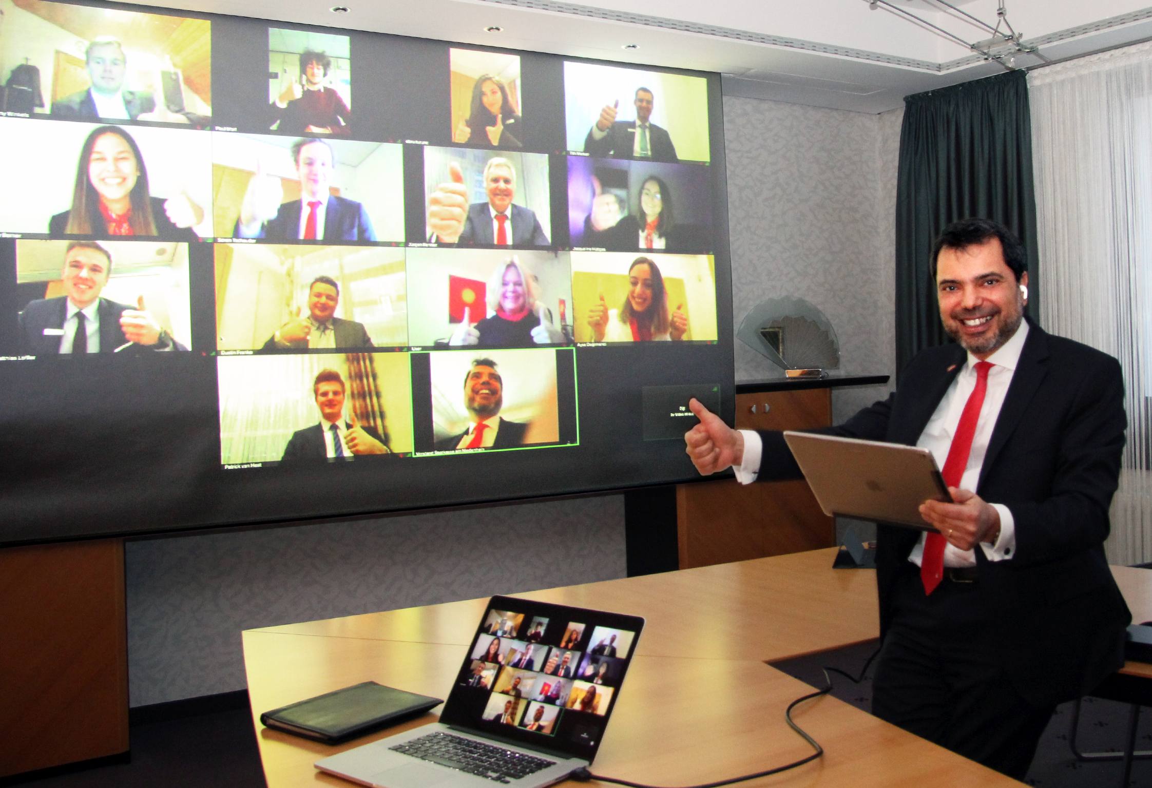 Erste digitale Lossprechung der Sparkasse am Niederrhein: Vorstandsvorsitzender Giovanni Malaponti gratulierte den Auszubildenden des dritten Lehrjahres, die kurz zuvor alle erfolgreich unter strengen Corona-Regeln ihre letzten Prüfungen mit Abstand und Maske absolviert hatten.