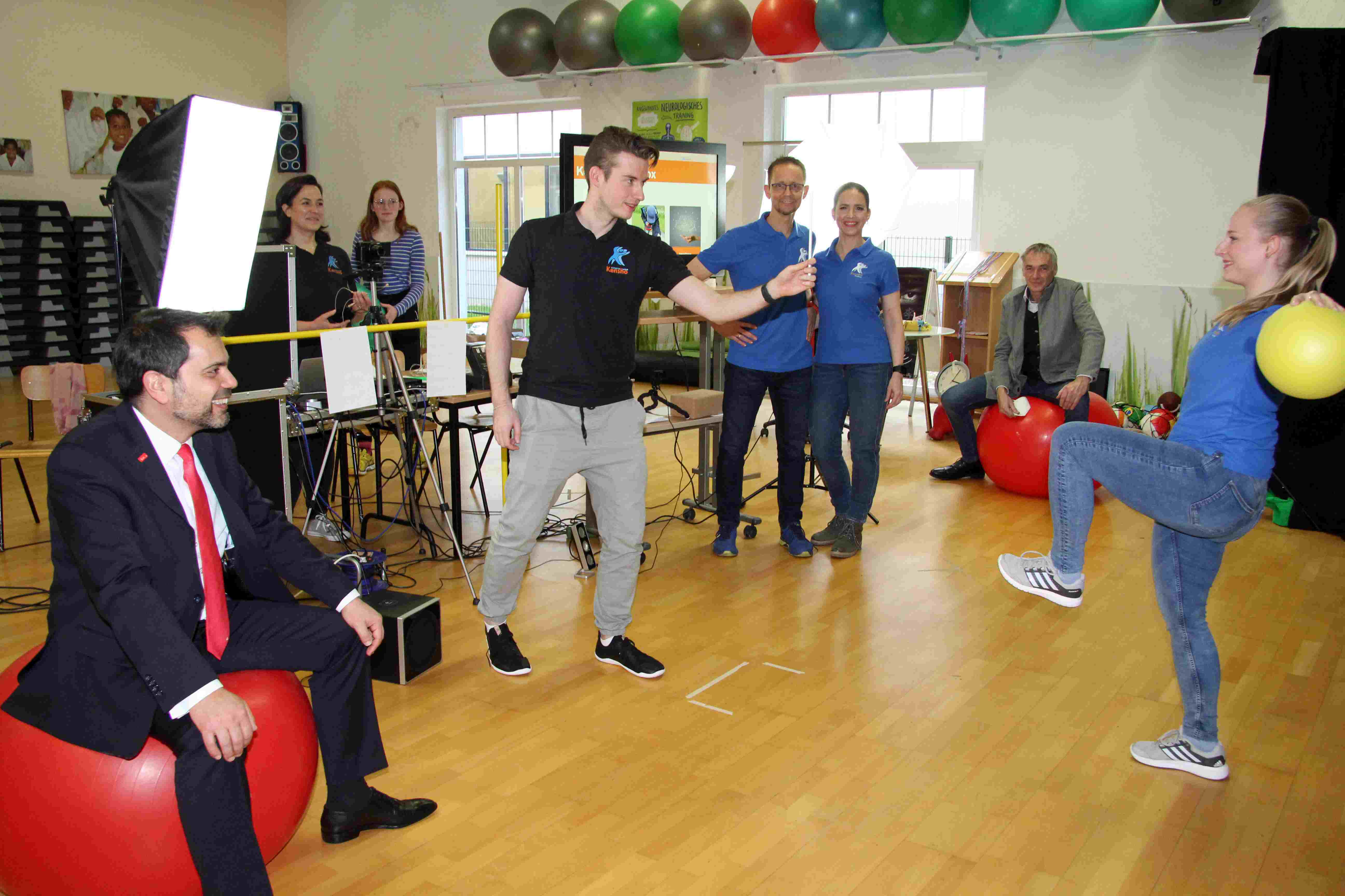 Zu Gast bei den Dreharbeiten für die Kensho-Box für Kinder: Bürgermeister Ralf Köpke (2.v.r) und Giovanni Malaponti (ganz links). Dirk Schauenberg und seine Frau Magdalena (Mitte) hatten mit ihrem Team die Idee zu dieser Fitness-Initiative. Sportwissenschaftler Kevin Grafen und Karate-Trainerin Olivia Kittel drehen gerade eine Übung für Koordination und Gleichgewicht. Hinten links: Physiotherapeutin Monika Everaert und Praktikantin Lovis Höschen.