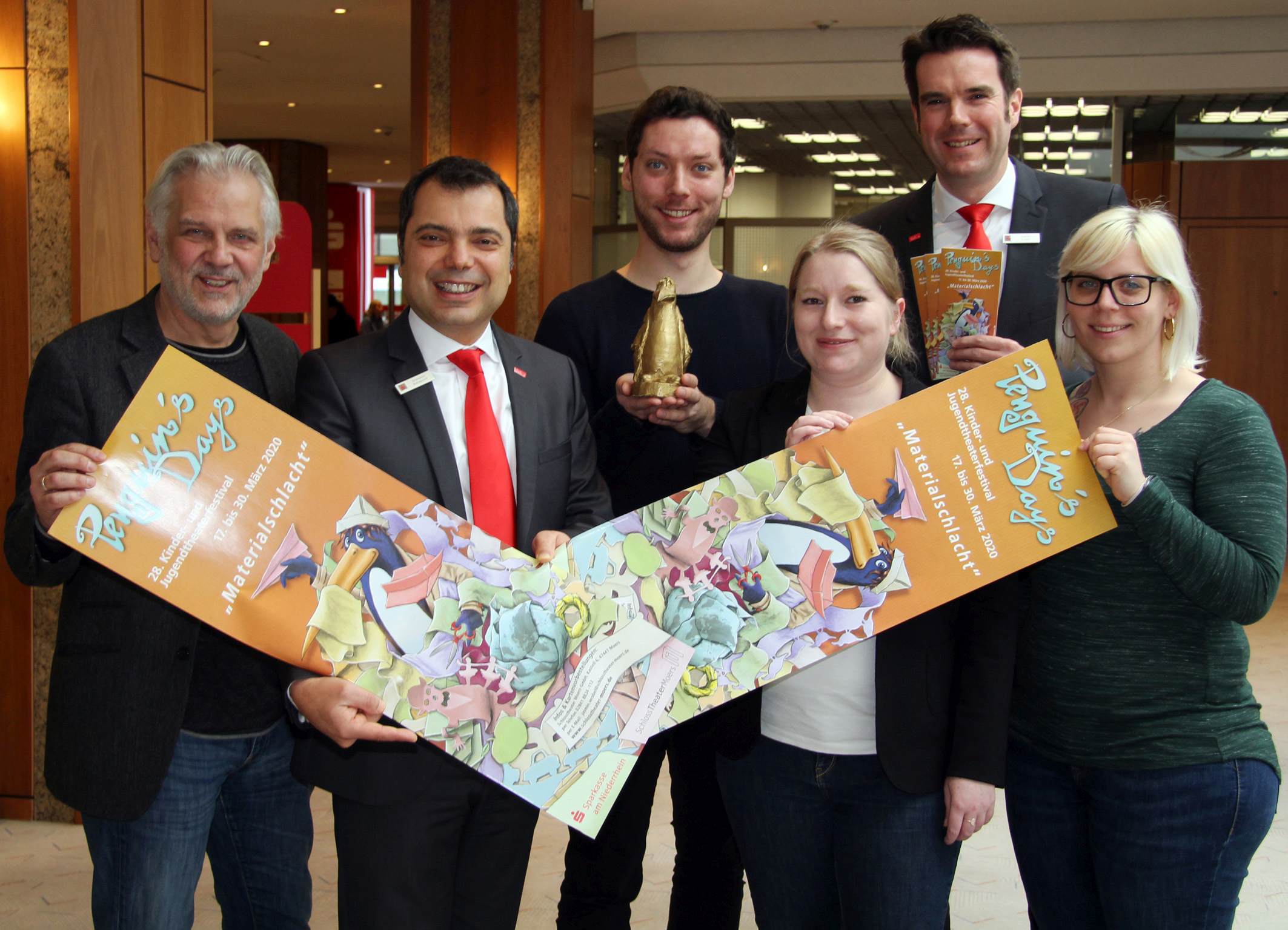 Ulrich Greb (ganz links) erhält den Großen Kulturpreis der Sparkassen-Kulturstiftung Rheinland. Hier ist er bei der Vorstellung der 28. Penguin’s Days im Februar 2020 zu sehen. Das Theaterfestival für Kinder und Jugendliche ist eines der vielen Projekte, die unsere Sparkasse seit vielen Jahren in Kooperation mit dem Schlosstheater unterstützt. Nach rechts: Vorstandsvorsitzender Giovanni Malaponti, Robert Hüttinger Kathrin Leneke, Stefan Ertelt und Jasmin Wrobel.