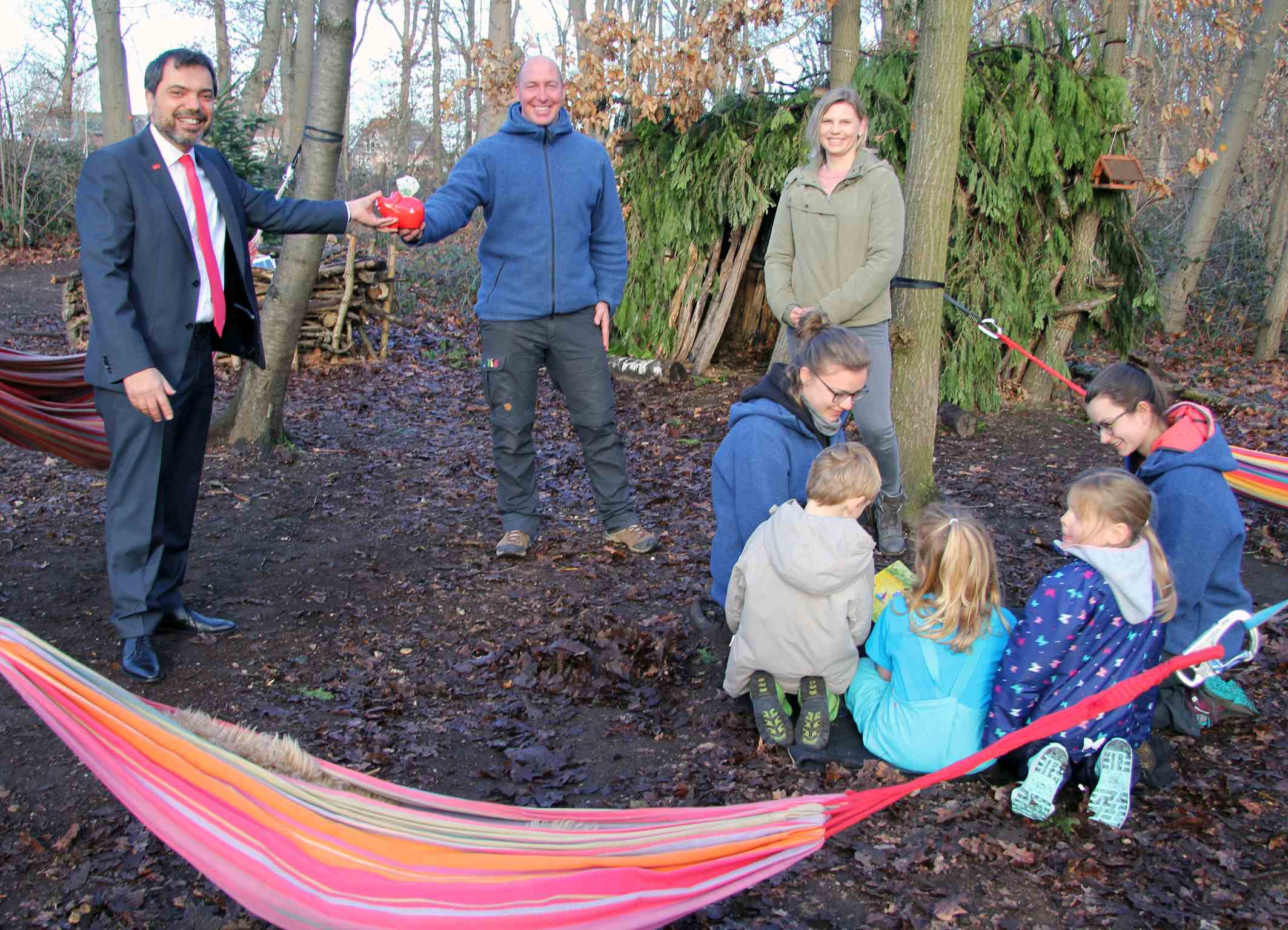 Giovanni Malaponti (ganz links) besuchte den Waldkindergarten in Alpen und brachte 1.704,15 Euro aus dem Kundenspendenprogramm GiroCents mit. Carlo Ridder und Denise Kühn (hinten, rechts) wissen schon, wo sie das Geld investieren: draußen.