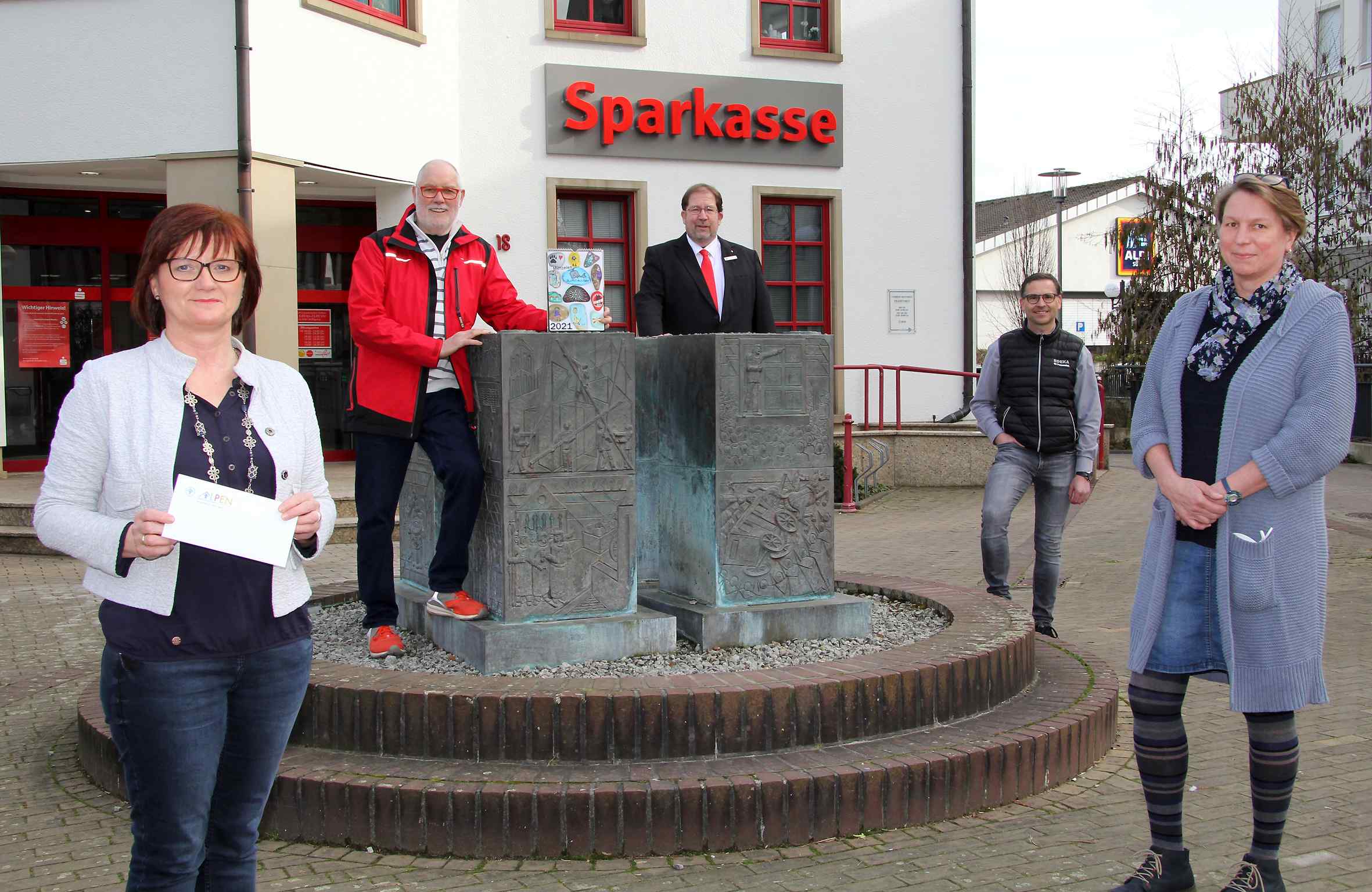 Karin van Bonn (v.l.n.r.) freut sich über 1.026,50 Euro für den Alpener Kinderschutzbund. Hans-Josef Angenendt spendete alle Erlöse aus dem Verkauf seines Menzelener Fotokalenders. Volker Oppers gab im Namen der Sparkasse am Niederrhein 250 Euro dazu. Thomas Luft unterstützte mit seinem Edeka-Supermarkt den Kalenderverkauf und ist Partner des Kinderschutzbundes bei dessen Taschen-Aktion. Tatjana Keymer verschickt Jahr für Jahr den Kalender als Weihnachtsgeschenk nach Neuseeland.