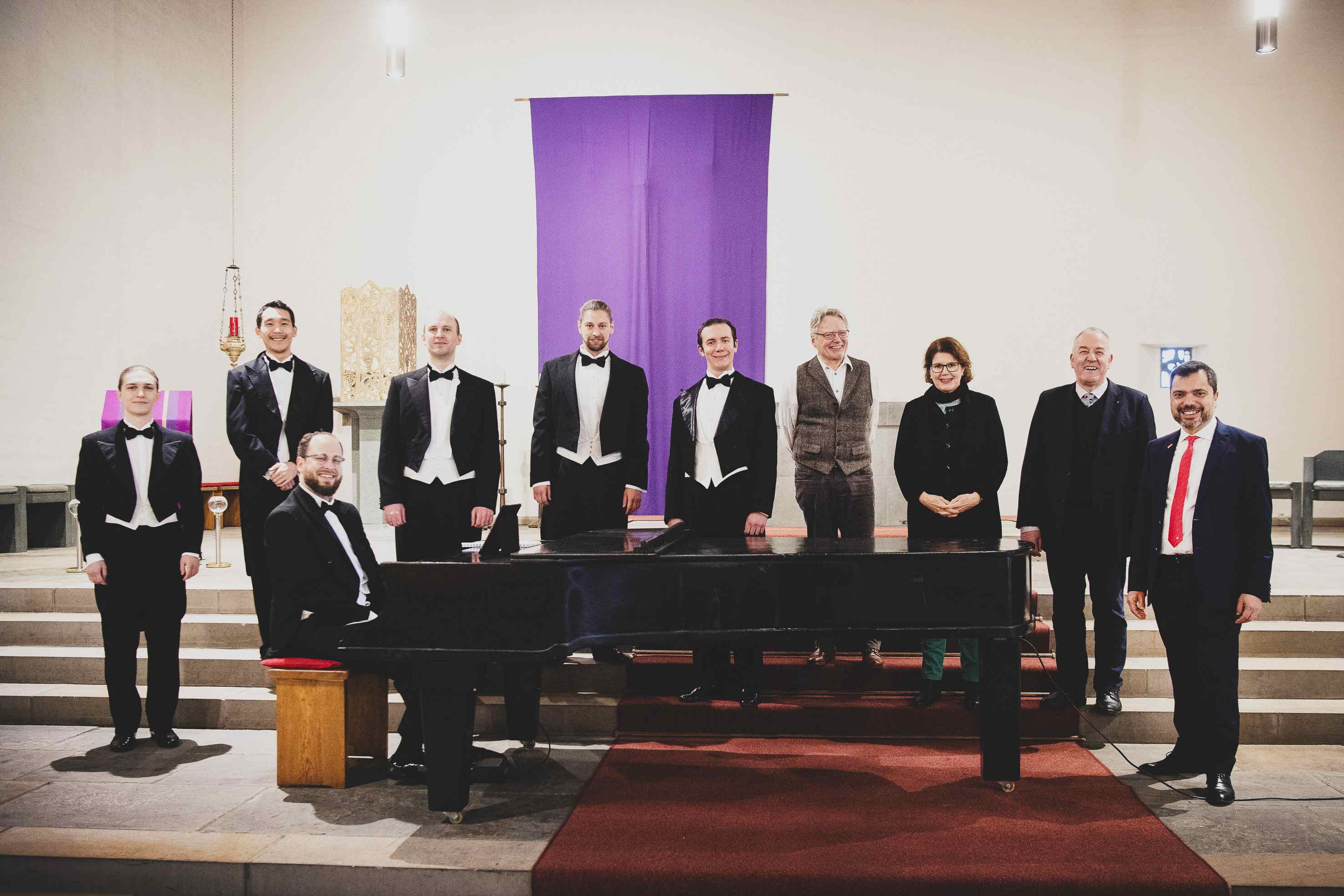 Ensemble & Initiatoren (v.l.n.r.): Ilja Aksionov, Tenor, Jin Su (James) Park, Tenor, Dennis Kittner, musikalische Leitung und der Mann am Klavier, William Drakett, Bariton, , Gereon Grundmann, Bassbariton, Robin Liebwerth, Bass, Konrad Göke, Sylvia Pleger, Pfarrerin Friedenskirche Krefeld, Herbert Werth, Pfarrer St. Martinus, Giovanni Malaponti, Vorstandsvorsitzender Sparkasse am Niederrhein. Das Foto war ohne Masken möglich, weil alle abgebildeten Personen einen tagesaktuellen, negativen Schnelltest vorweisen konnten. Foto: Bettina Engel-Albustin