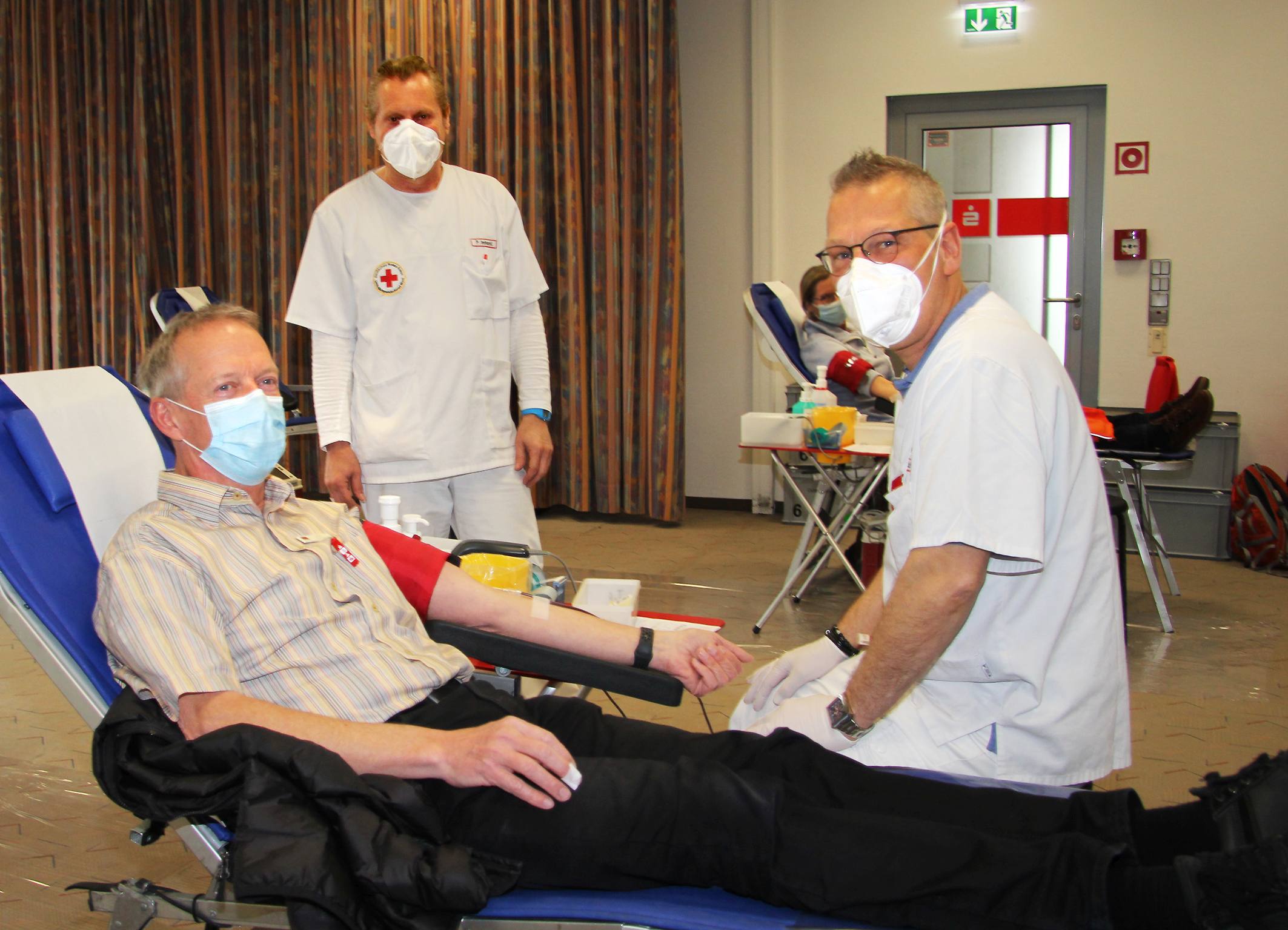 MOERS. Dreieinhalb Stunden war das Casino der Sparkassen-Hauptstelle für Blutspender wie Uwe Walter (l.) geöffnet. Der DRK-Blutspendedienst West zog eine erfreuliche Bilanz: Teamleiter Axel Schwedler (r.) und Helfer Peter Imhorst (Mitte) sowie ihre Kolleginnen und Kollegen begrüßten insgesamt 55 Spenderinnen und Spender, darunter acht Neulinge. Eine gute Nachricht für Krankenhäuser, die dringend auf Blutpräparate angewiesen sind, beispielsweise für Unfallopfer und Not-Operationen oder für die Behandlung von Krebspatienten und chronisch kranken Menschen.
