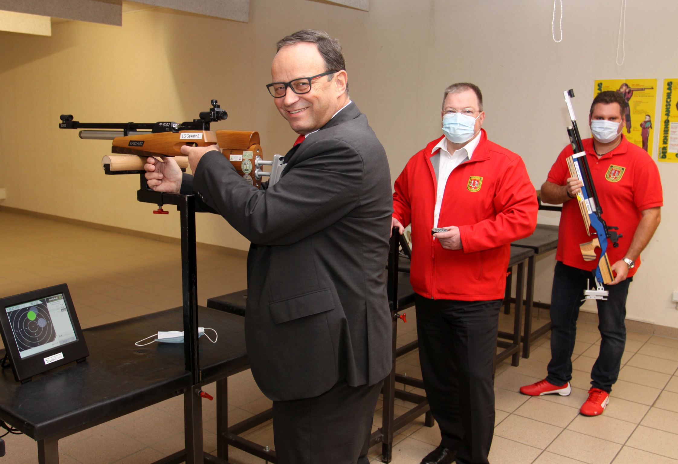 Frank-Rainer Laake (v.l.n.r.) bekommt den Treffer sofort auf dem Bildschirm angezeigt. Über weitere Vorteile der neuen, elektronischen Schießanlage im Schützenhaus am Innenwall informierten Schießmeister Michael Fritsche und sein Stellvertreter Michael Raß.