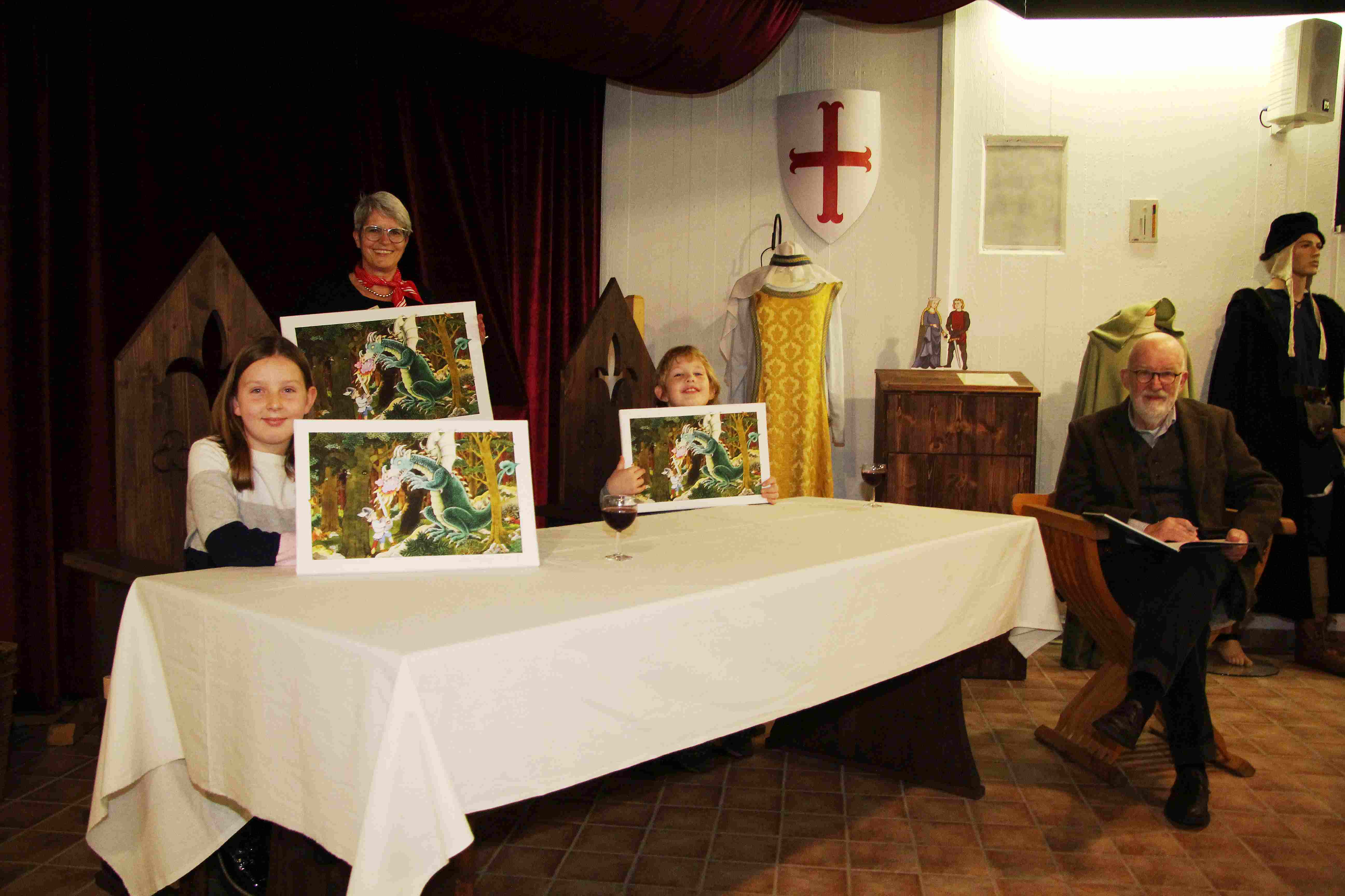 XANTEN. Drachenblut schmeckt gut, insbesondere dann, wenn es sich in Wirklichkeit um Kirschsaft handelt. Den gab es jetzt im Siegfriedmuseum für Julia Keuschen und Christian Michelet. Die beiden Neunjährigen hatten anlässlich der Sonderausstellung „Jung-Siegfried“ die Quizfragen zum Buch richtig beantwortet. Zur Preisverleihung kam Jürgen ‚Moses‘ Pankarz, der die Bilder für das Heldenbuch gezeichnet und koloriert hat. „Insgesamt haben 55 Kinder bei dem Gewinnspiel mitgemacht, ihr wurdet gezogen“, berichtete Monika Pogacic von der Sparkasse am Niederrhein, die zu dem Gewinnspiel eingeladen hatte.