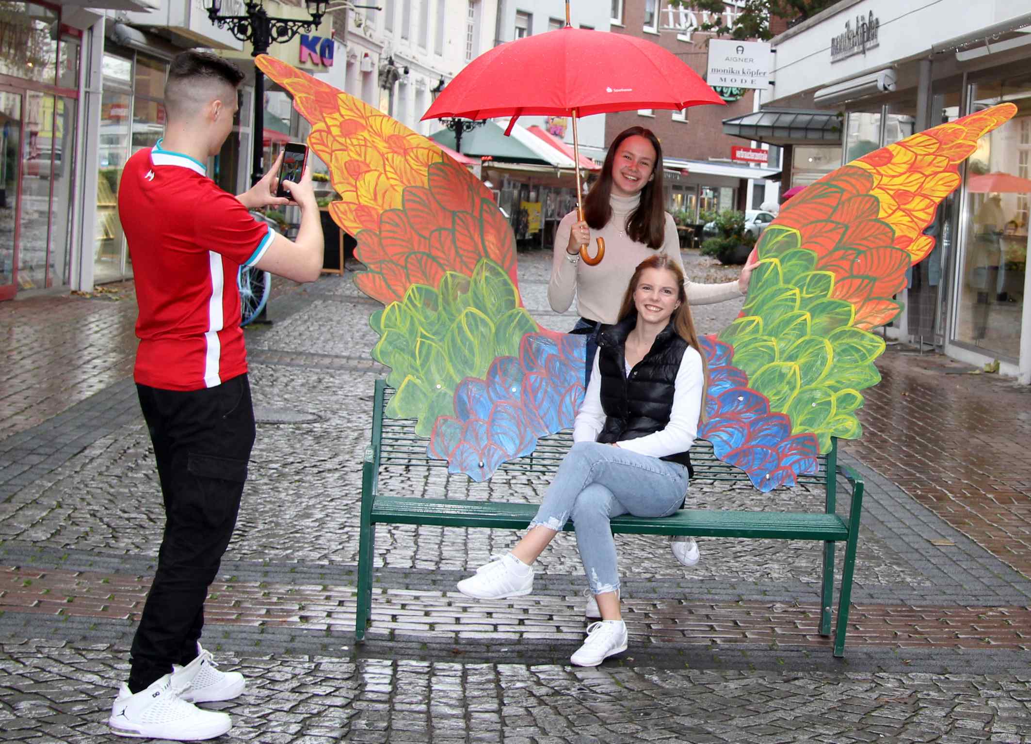 Luca Goebel (v.l.n.r.), Lina Clapak und Knete-Engel Mirjana Greve verkünden den Start der neuen Staffel des Videowettbewerbes der Sparkasse am Niederrhein für die Abschlussjahrgänge von weiterführenden Schulen, bei dem es wieder 1.000, 750 und 500 Euro zu gewinnen gibt.