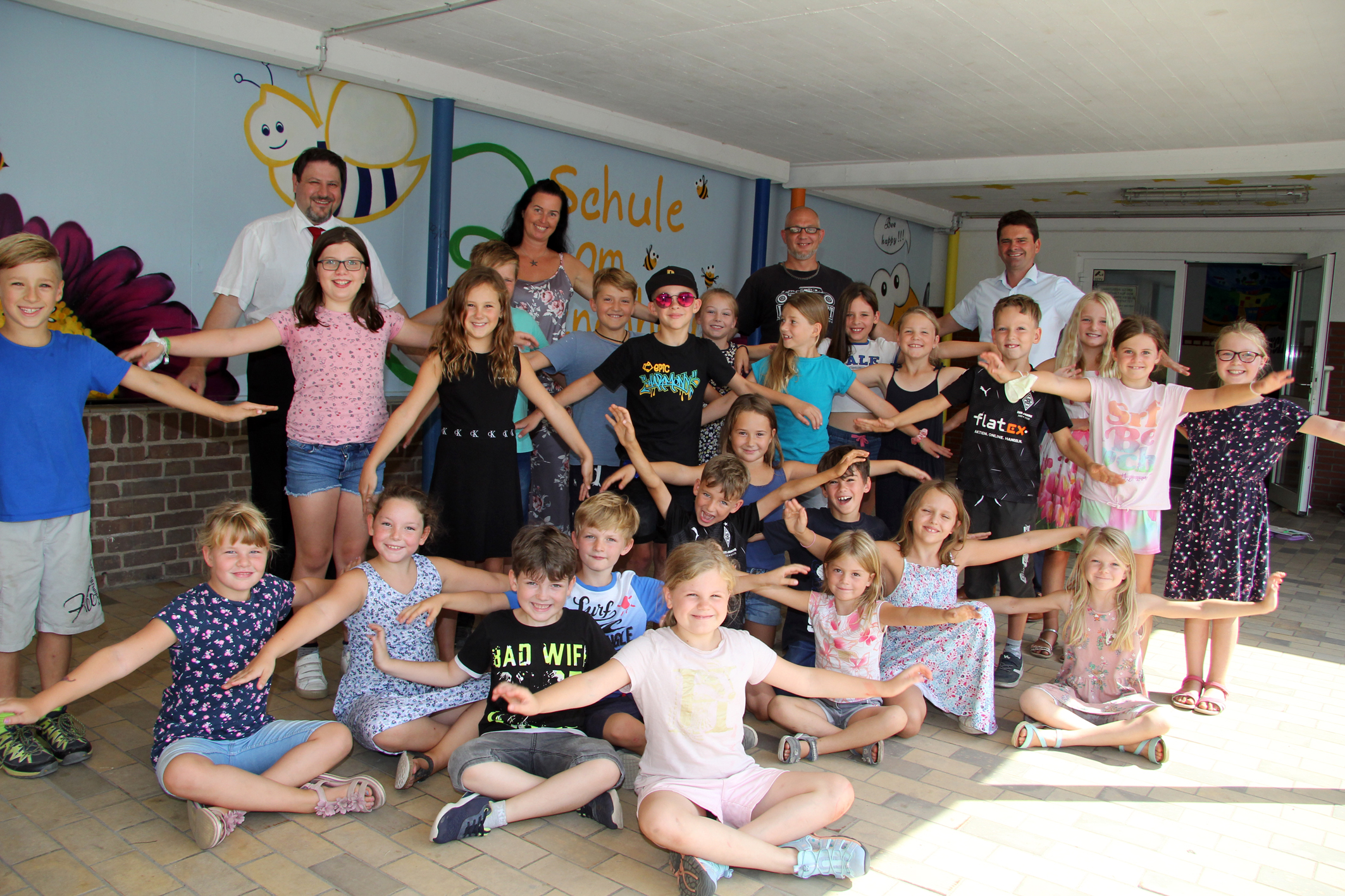 Kinder der Schule am Bienenhaus in Millingen summten und brummten bei der Vorstellung der neuen Bienenwand, die Sprayer Kai Hinz (Mitte, hinten) kurz zuvor fertiggestellt hatte. Schulleiterin Jasmin Brune und Severin Winnekens (ganz rechts) bedankten sich bei Julian de Vries von der Sparkasse für die Spende.
