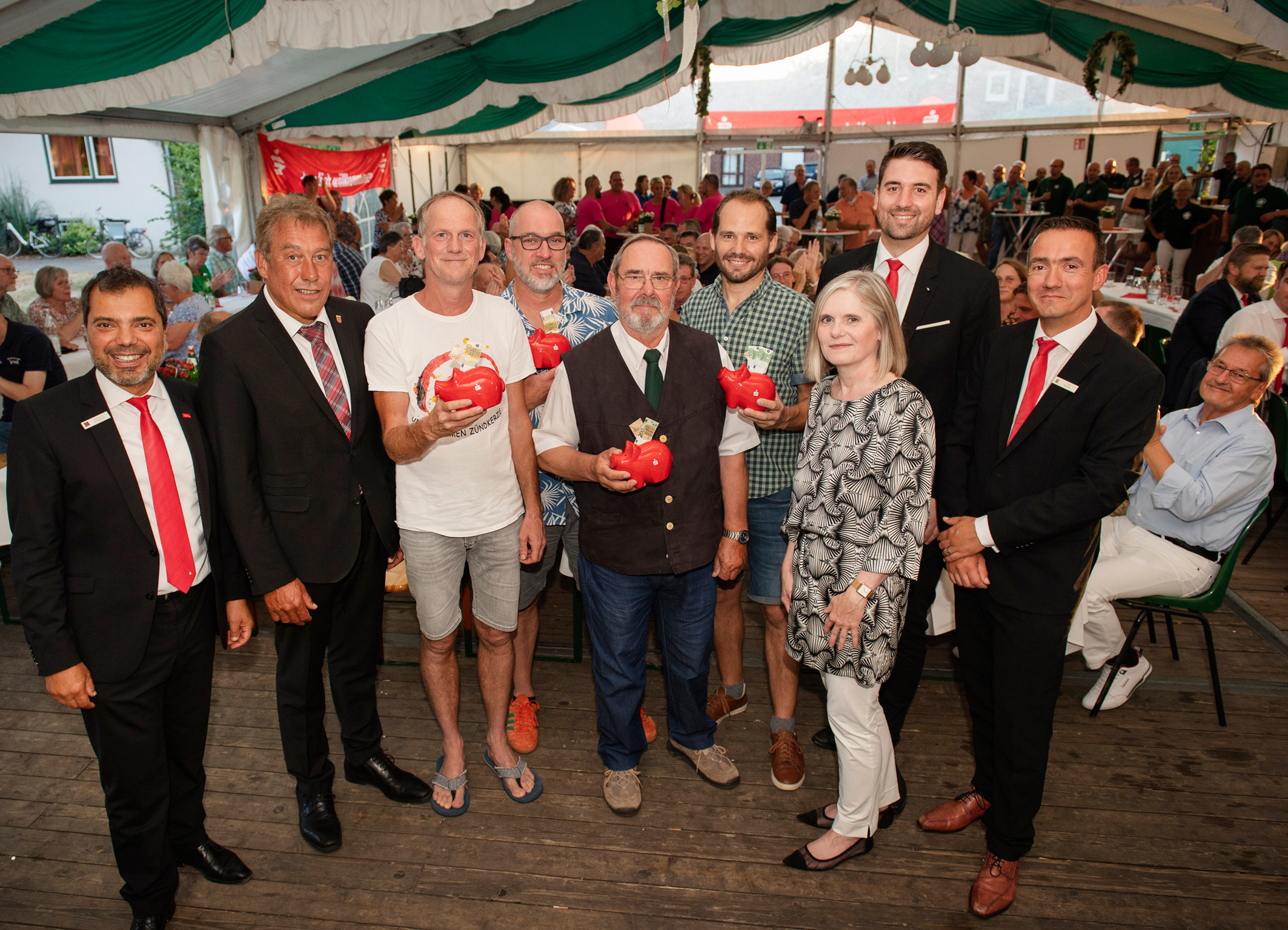 Rund 130 Gäste des Ehrenamtsforums erlebten im Festzelt in Hamb informative und unterhaltsame Gespräche mit engagierten Bürgern aus der Gemeinde sowie die Ziehung von viermal 250-Euro-Extraspenden. V.l.n.r.: Sparkassenchef Giovanni Malaponti, der stellvertretende Bürgermeister Matthias Broeckmann, Gregor Joosten (Unternehmen Zündkerze), Clemens Tenhagen (KK Sportschützen), Johannes Hanßen (Heimat- und Verkehrsverein), Jürgen Teloo (SV Sonsbeck) und Claudia van Dyck sowie Geschäftsstellenleiter Markus Hans und sein Vorgänger Tim Rütters.