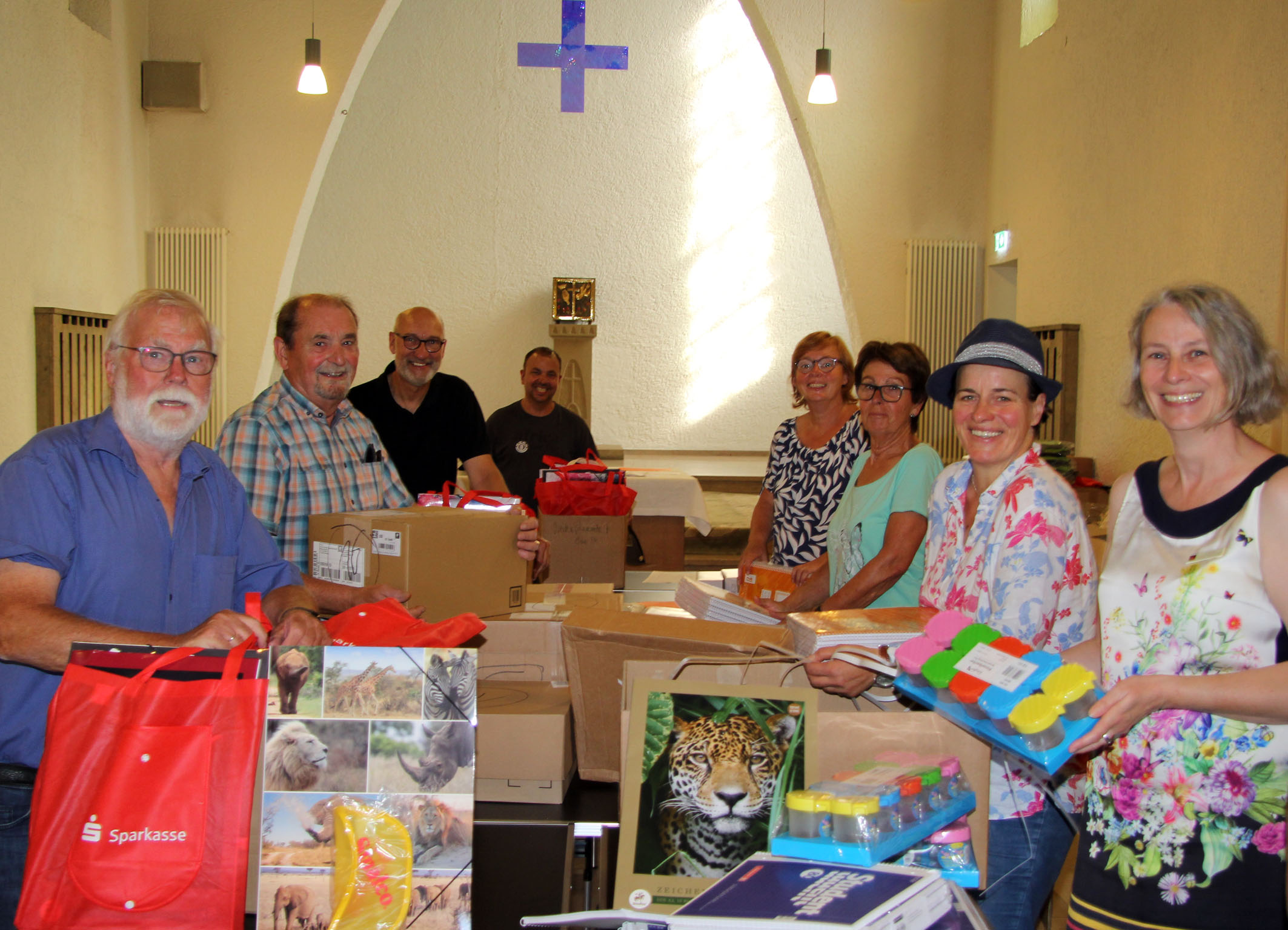 In der Kapelle des ehemaligen Konvikts packen die Ehrenamtlichen der Schulmaterialkammer die Basispakete zum Schulbeginn. Ganz links: Georg Welp, ganz rechts: Andrea Kabs-Schlusen von der Sparkasse am Niederrhein.