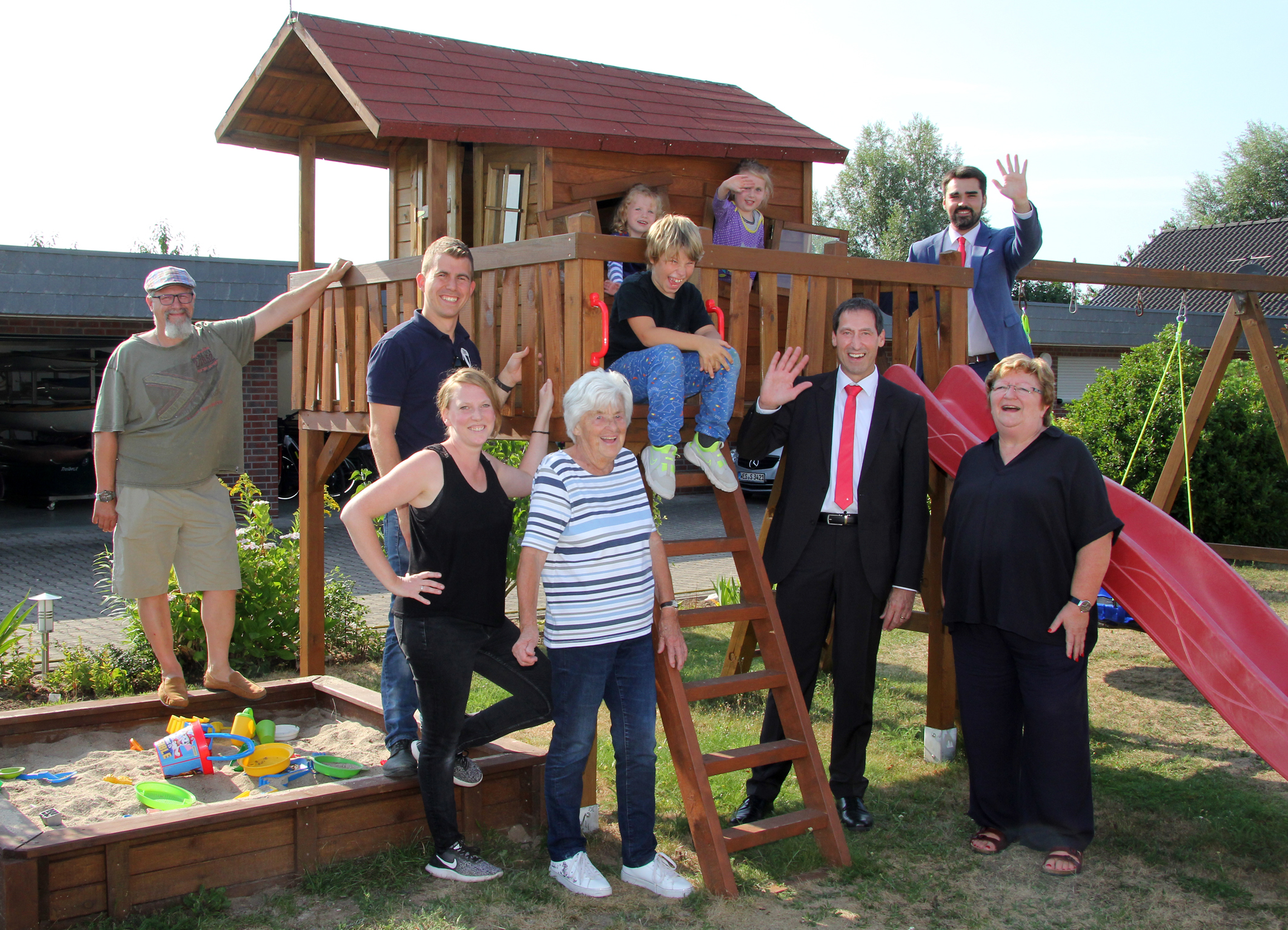 Die Zelt- und Wassersportfreunde Rheintreue haben die 1.000-Euro-Spende der Sparkasse am Niederrhein gut angelegt. Über das neue Spielhaus und den Sandkasten freuen sich v.l.n.r. Stefan Sämisch, Andreas und Danica Hirt, Lore Schapeit, Mathilda, Simon, Josefine, Norbert Kubik und Nils Schwenner von der Sparkasse und die Vereinsvorsitzende Andrea Rother.