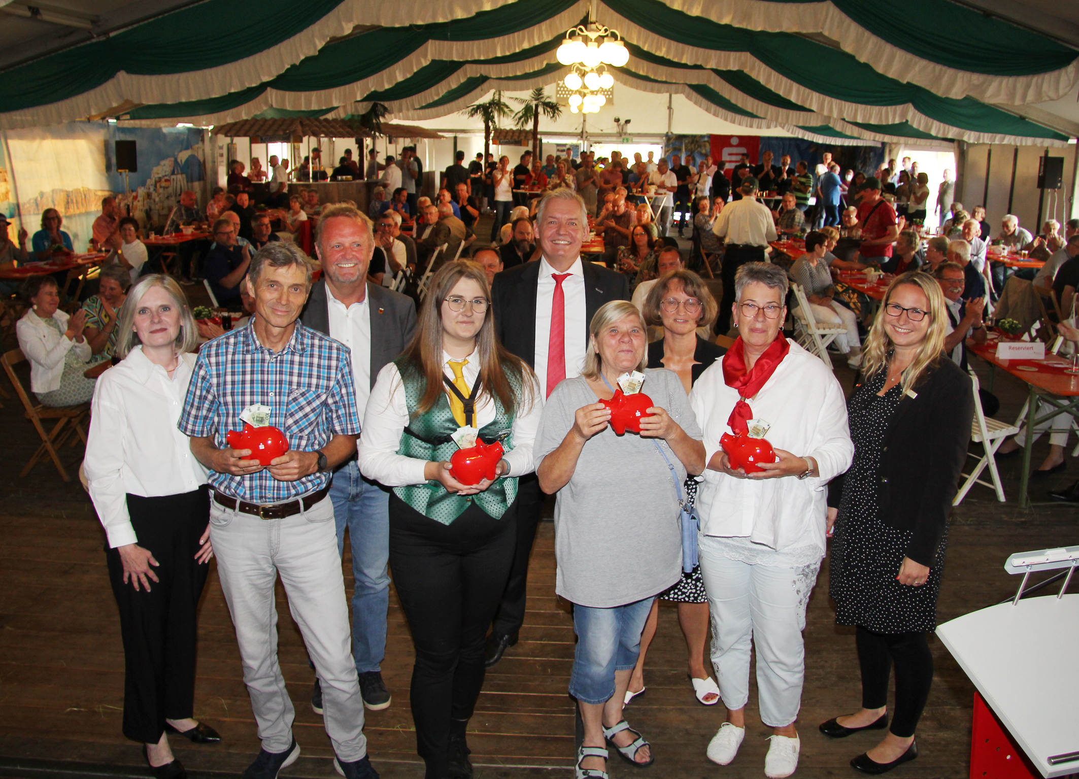 Über 200 Gäste erlebten im Festzelt der St.-Heinrich-Schützenbruderschaft Bönning-Rill ein informatives und unterhaltsames Ehrenamtsforum, zu dem die Sparkasse am Niederrhein eingeladen hatte. Neben Vereinstalk, Hunde-Show und Musik gab’s auch wieder eine spannende Ziehung von Extra-Spenden. V.l.n.r.: Verwaltungsratsvorsitzende Claudia van Dyck, Günter Bachmann (LG Alpen), Bürgermeister Thomas Ahls, Marie-Kristin Verpoort (Ferienhilfswerk Menzelen-Ost), Sparkassenvorstand Bernd Zibell, Elke Friebel (Behinderten-Sport-Gemeinschaft), stellvertretende Geschäftsstellenleiterin Heike Letschert, Angelika Eßelborn (Frauengemeinschaft Bönninghardt) und Geschäftsstellenleiterin Kathrin Hüsch.