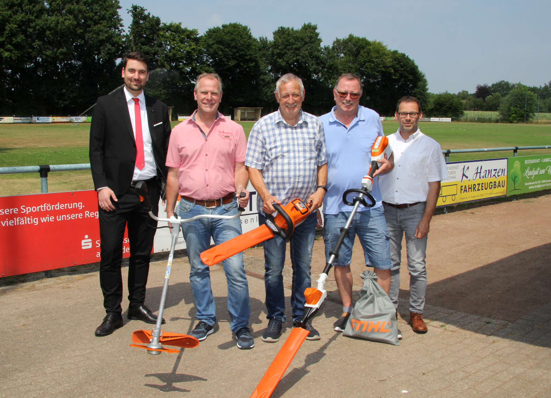 Die DJK Labbeck-Uedemerbruch verfügt jetzt über drei neue, akkubetriebene Geräte für die Pflege des Vereinsgeländes. Detlev Geuyen präsentiert die Motorsense, Matthias Theunissen den kurzen Heckenschneider und Heiner Quinders den langen. Die Kosten von rund 2.000 Euro teilten sich die Sparkasse am Niederrhein und die Gemeinde Sonsbeck. Geschäftsstellenleiter Markus Hans (l.) und Fachbereichsleiter Ludger van Bebber (r.) besuchten die schöne Platzanlage.