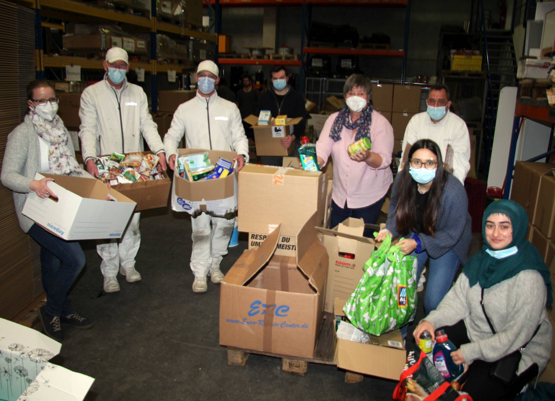 Brunhild Demmer vom Caritasverband Moers-Xanten (4.v.r.) packte in den vergangenen Tagen mit einem Team aus Ehrenamtlichen und Mitarbeitern 40 Tonnen Lebensmittel und Hygieneartikel zusammen, die inzwischen mit einem Hilfstransport auf dem Weg zu den Menschen aus der Ukraine sind.