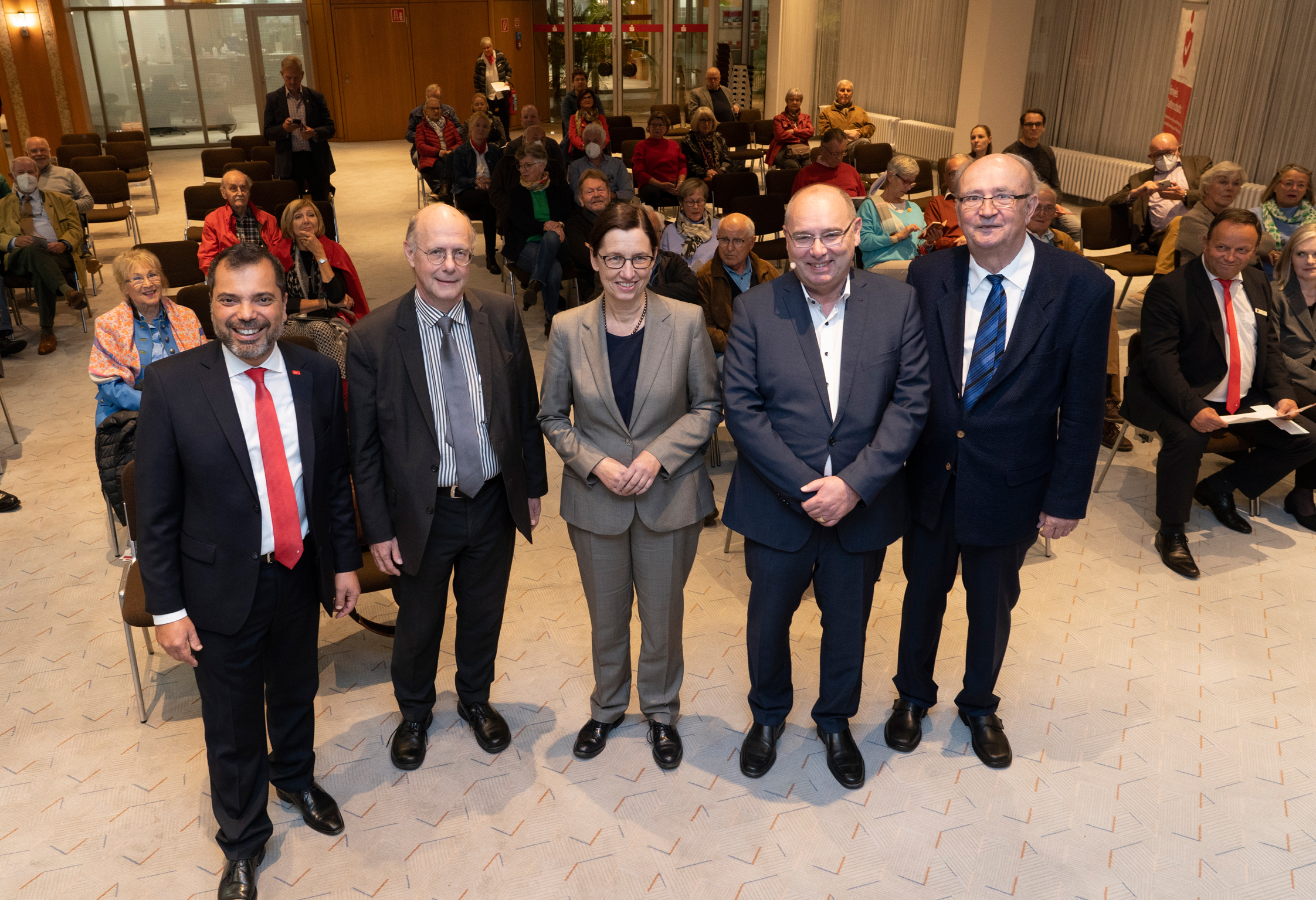 Zur Eröffnungsveranstaltung der 35. Universitätswochen waren rund 60 Zuhörer in die Hauptstelle der Sparkasse am Niederrhein gekommen. Sparkassenchef Giovanni Malaponti (v.l.n.r.) begrüßte Professor Bernd Noche, Professorin Barbara Albert, Professor Dieter Schramm und Dr. Klaus-G. Fischer.