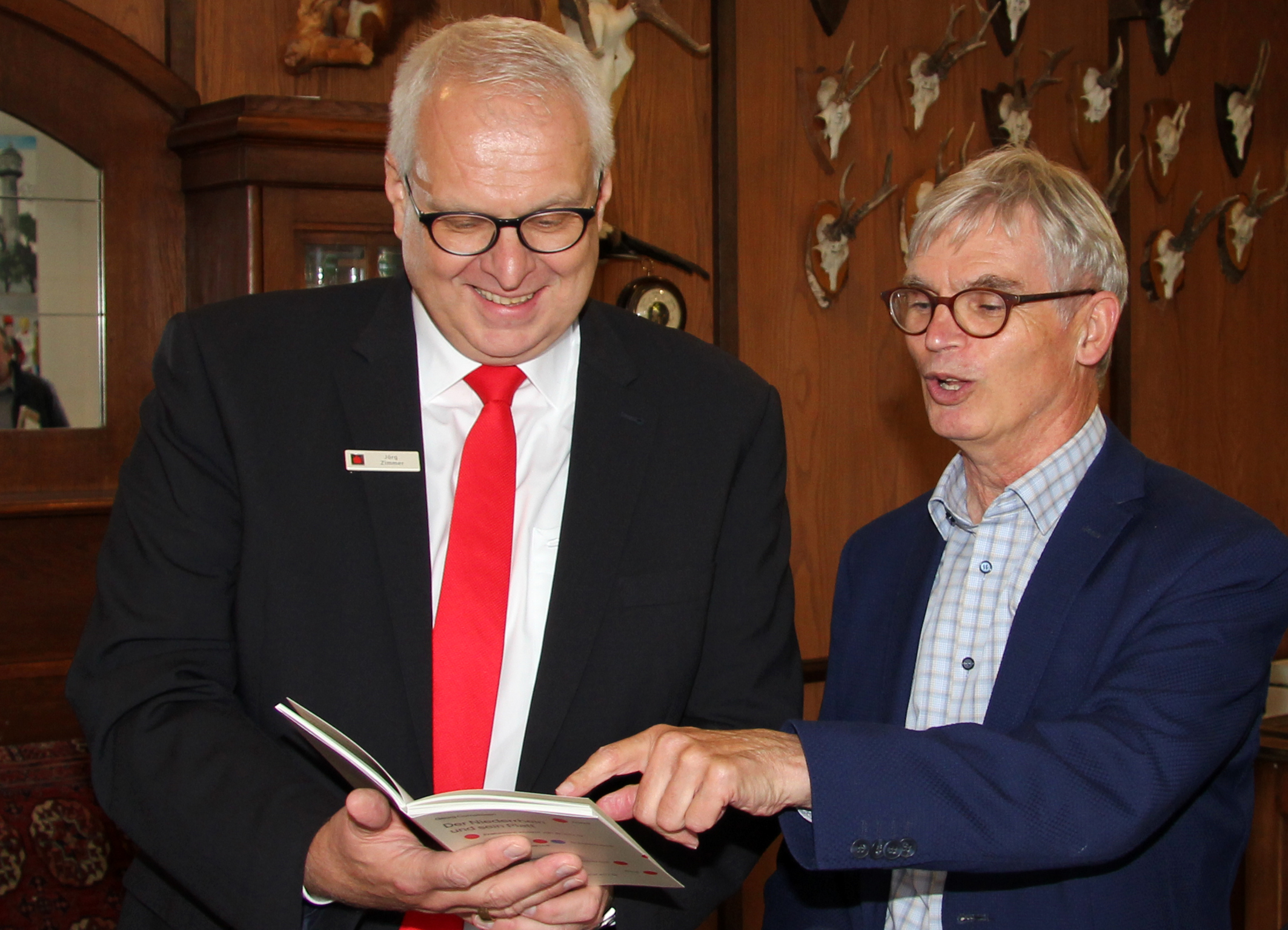 Der Sprachforscher Dr. Georg Cornelissen (rechts), hier mit Sparkassen-Pressesprecher Jörg Zimmer, stellte jetzt sein neues, sehr humorvolles und kurzweiliges Buch ‚Der Niederrhein und sein Platt‘ vor.