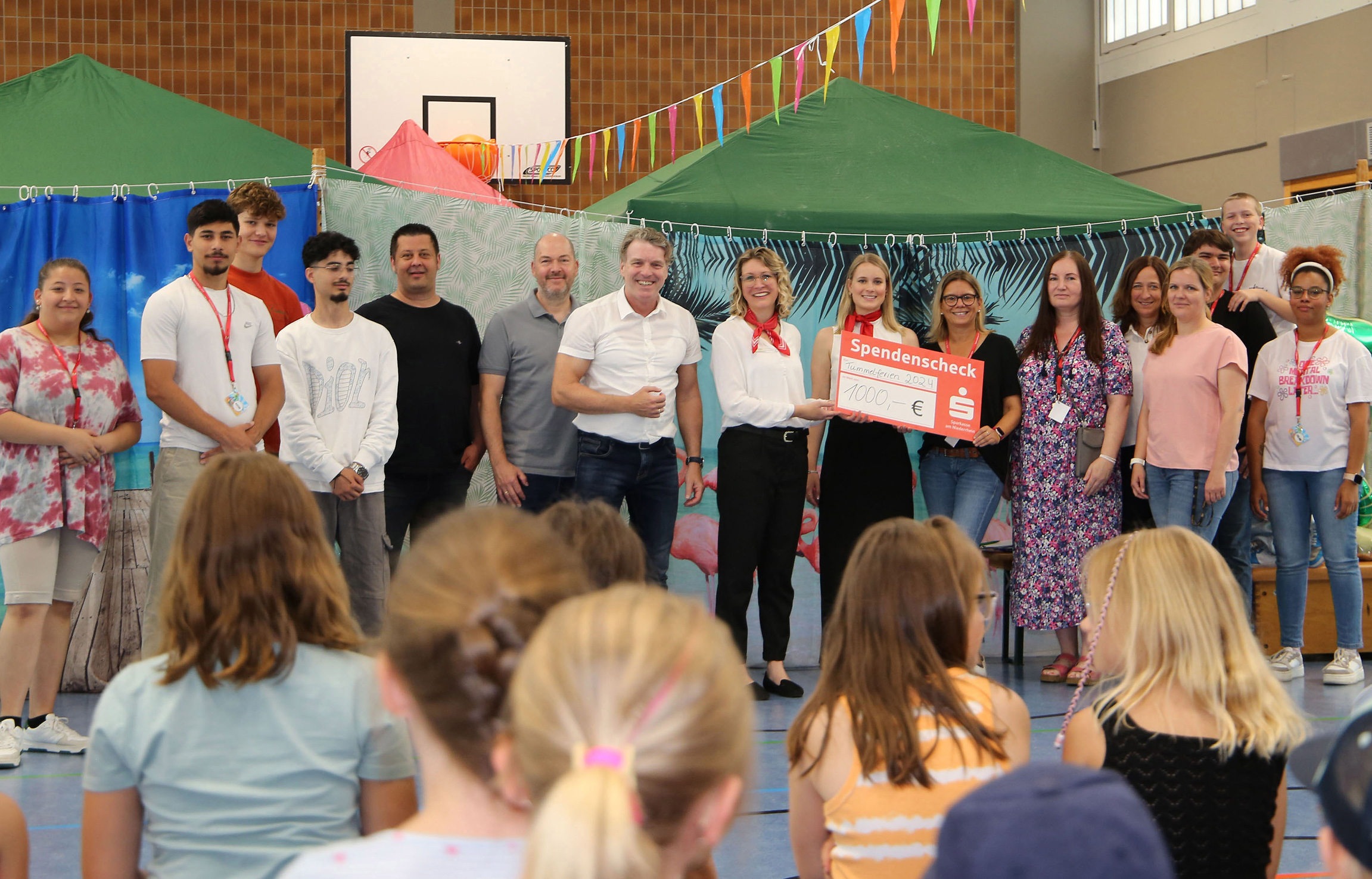 MOERS. Strahlende Kinderaugen, glückliche Betreuerinnen und Betreuer und eine bunte Bühne. Vor dieser Kulisse übergaben Lena Kempken und Melanie Peschik von der Sparkasse am Niederrhein symbolisch einen überdimensionalen Scheck über 1.000 Euro an die Mitarbeiterinnen der Offenen Einrichtung für Kinder ‚Asbär‘ der AWO. Das Team organisiert auch in diesem Jahr wieder in Kooperation mit dem Jugendamt der Stadt Moers den Spielpunkt in Asberg.
