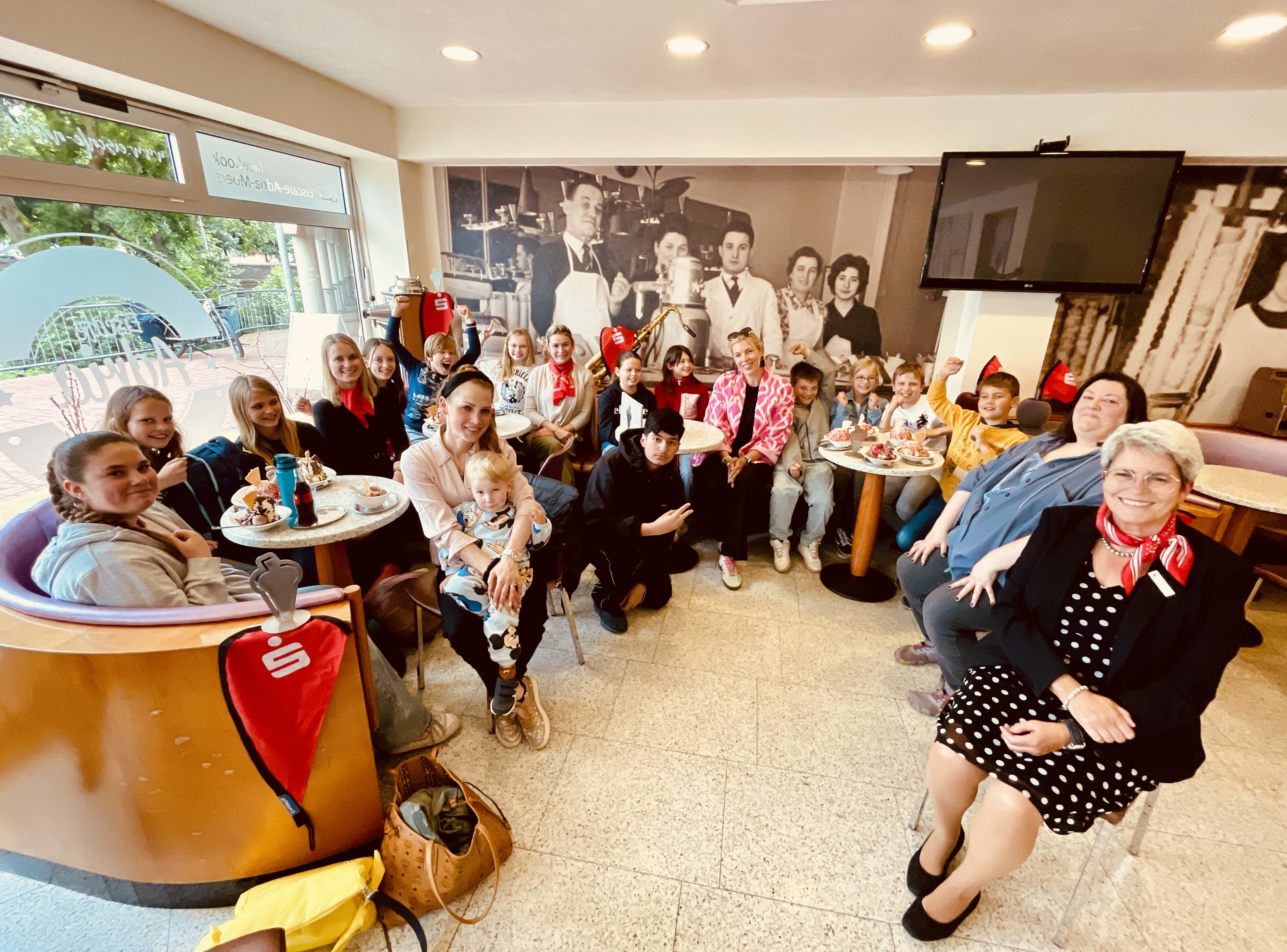 Monika Pogacic (ganz rechts) und ihre Kollegin Lena Kempken (4.v.l.) von der Sparkasse am Niederrhein überreichten den erfolgreichen Nachwuchsredakteurinnen und -redakteuren Preisgelder von jeweils 300 Euro und luden alle zum Eis ein.