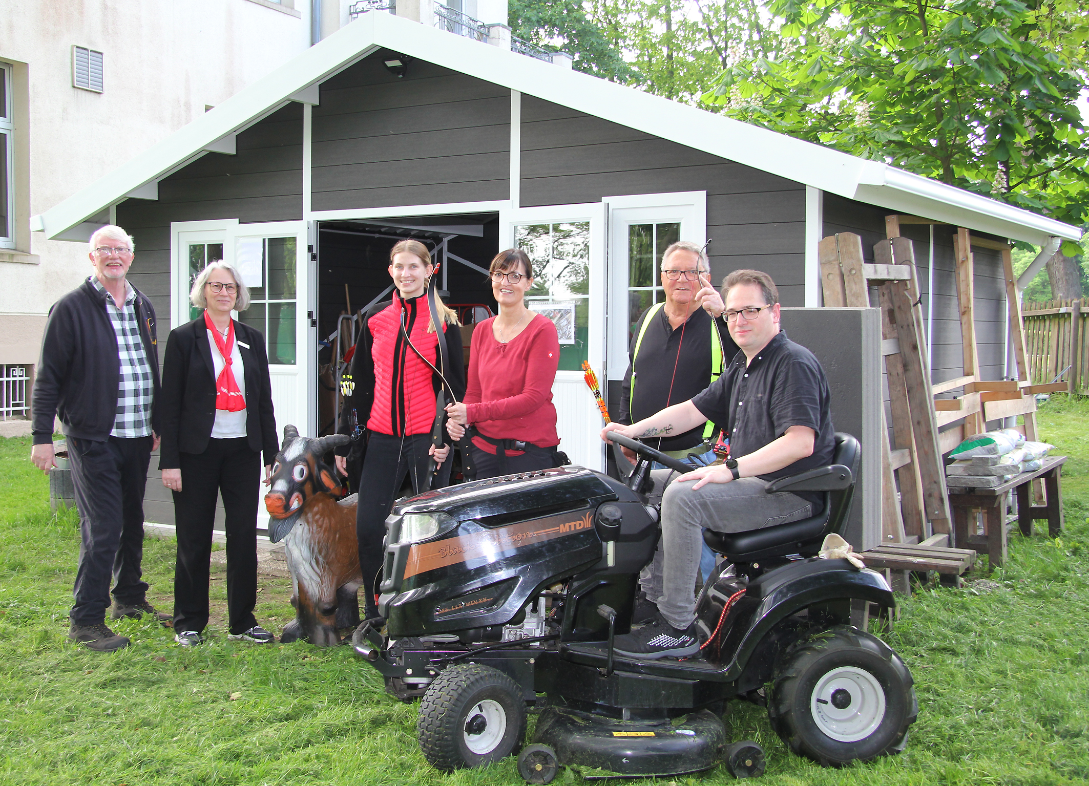 BSC-Präsident Josef Joosten, Andrea Kabs-Schlusen von der Sparkasse am Niederrhein, Maskottchen Poldi, Leonie Ritter, Sabine Müller, Carsten Boland und Walter Amelang vor der neuen Hütte, in der neben dem Rasenmäher-Traktor alle Werkzeuge, Bogenschützen-Zubehör und viele weitere Dinge einen sicheren Platz finden.