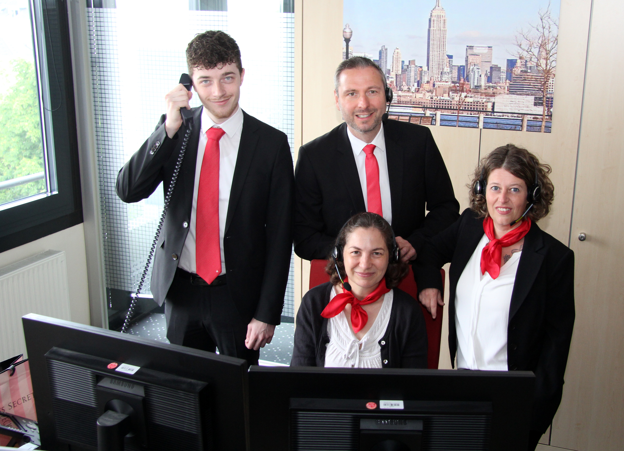 Die Sparkasse am Niederrhein nimmt am Montag, 27. Mai, eine neue Telefonanlage in Betrieb. Das Bild zeigt die Online-Berater Tom Angenendt (v.l.n.r.), Carsten Thelen, Elke Buch und Stefanie Horst aus der Internet-Filiale, die auch für den zentralen Telefon-Service der Sparkasse zuständig ist.